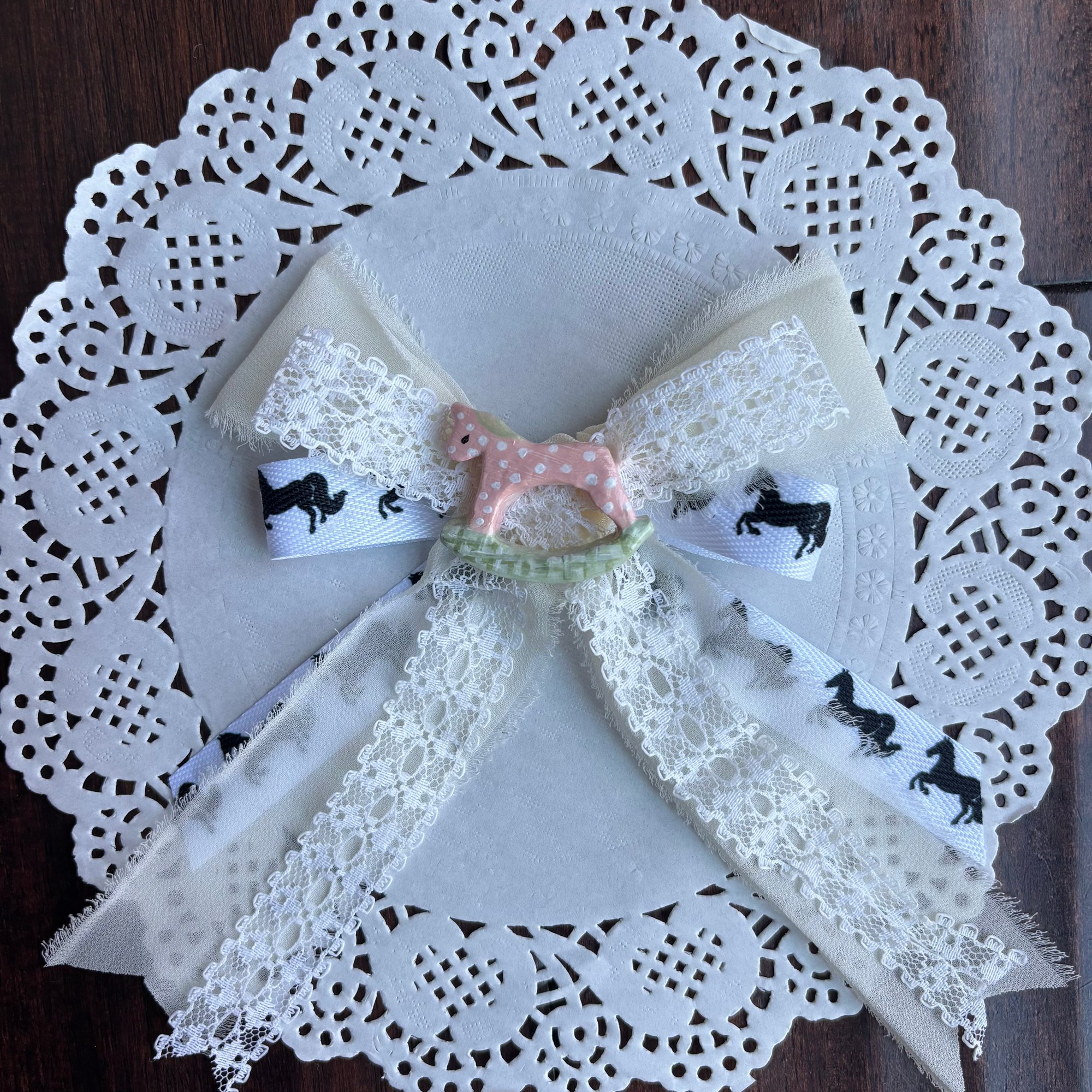 Rocking horse (slide 1): 5 x 6.5 in. Chiffon, lace, and polyester horse pattern ribbon.